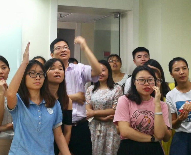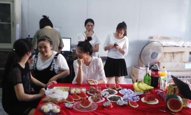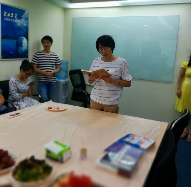 总部下午茶火热进行的同时,火炼树办公的同事的下午茶活动也如期举行,他们把几张桌子拼成一个大桌,铺上红布,摆满食物,主持人用手提电脑替代了屏幕,活动中你一段我一段的文章朗诵、你一题我一题的踊跃抢答照样精彩,相比总部稍为简陋的办公环境并不能削减大家对下午茶活动的参与热情。