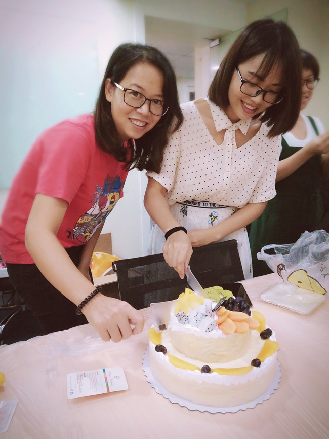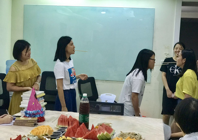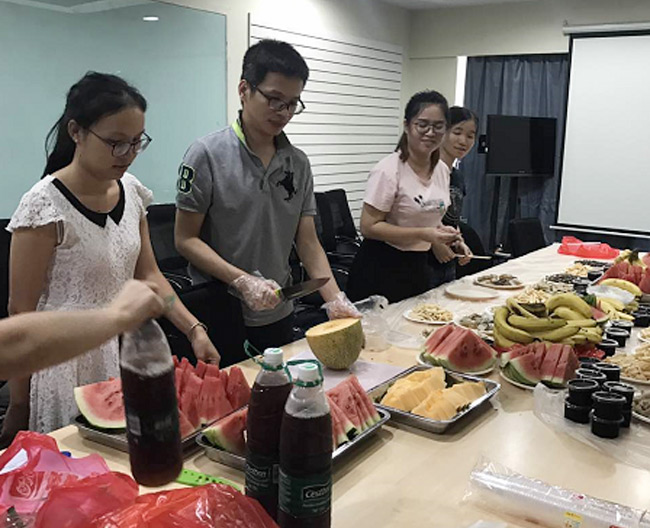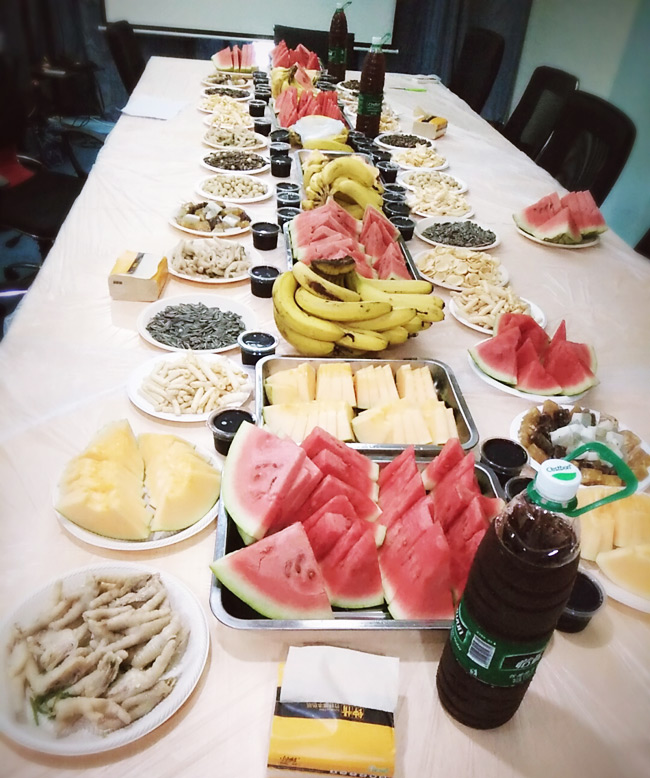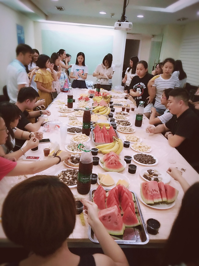 总部下午茶火热进行的同时,火炼树办公的同事的下午茶活动也如期举行,他们把几张桌子拼成一个大桌,铺上红布,摆满食物,相比总部稍为简陋的办公环境并没有削减大家对下午茶活动的参与热情。