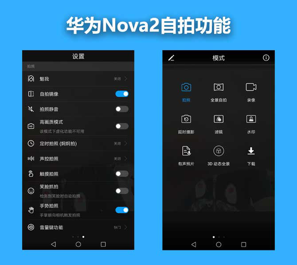在自拍模式中,HUAWEI nova 2 Plus还提供了全景自拍、延时摄影、实时滤镜、有声照片、3D动态全景这些模式,功能更加丰富,自拍更有趣。并且为了帮助用户能拍出更好的照片,在设置中增加了自拍镜像、定时拍照(炯炯拍)、笑脸抓拍、手势拍照等功能,辅助用户在自拍时更加Easy。