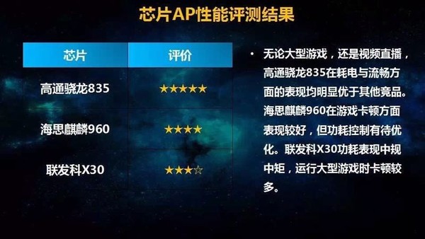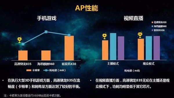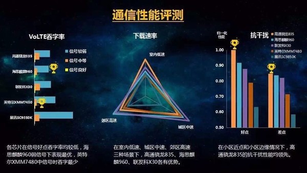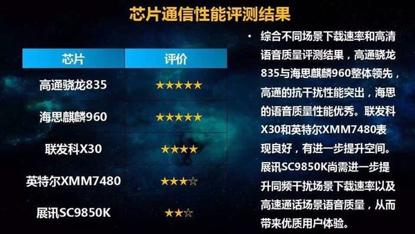 此外在旗舰芯片的评测中,中国移动对芯片的通信性、AP性能进行了评测对比得出,高通骁龙835芯片在不同场景下载速率与高清语音质量对比中整体领先,高通的抗干扰能力尤为突出,用户体验更佳。