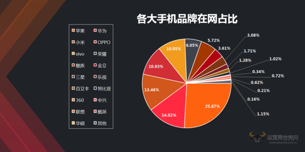 据《报告》显示,在网监测列有36款手机品牌,其中在网用户占比前五的手机品牌分别是苹果、华为、小米、OPPO、vivo,而像魅族、金立、中兴、三星、努比亚则依托于各自手机品牌优势,保持着稳定发展。