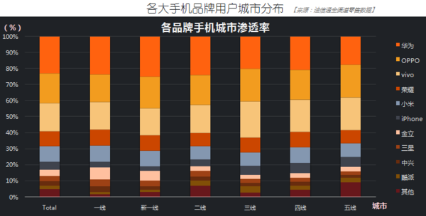 而在各大手机品牌地域分布也差异较大。据零售数据显示,各大手机品牌地区分布相对均衡,但相对来说,华为在华南、西北、华中地区优势更明显,OPPO在东北地区、vivo在西北地区则非常受欢迎。