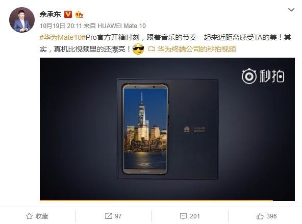 微博原文写道,“#华为Mate10#Pro官方开箱时刻,跟着音乐的节奏一起来近距离感受TA的美!其实,真机比视频里的还漂亮![得意]”,从博文的口气中不难看出,余承东对于这款手机产品的信心十足!