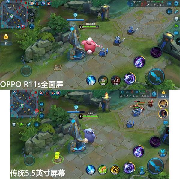 首先在画面观感上,OPPO R11s 全面屏,能带来更辽阔的视野,直接比传统手机多出 10% 的画面内容,王者荣耀开黑是,无疑能拥有「开挂」般的游戏体验。