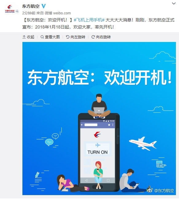 1月18日,东方航空率先宣布:2018年1月18日起,欢迎大家,率先开机。 据悉,这是国内首家开放手机使用的航空公司。