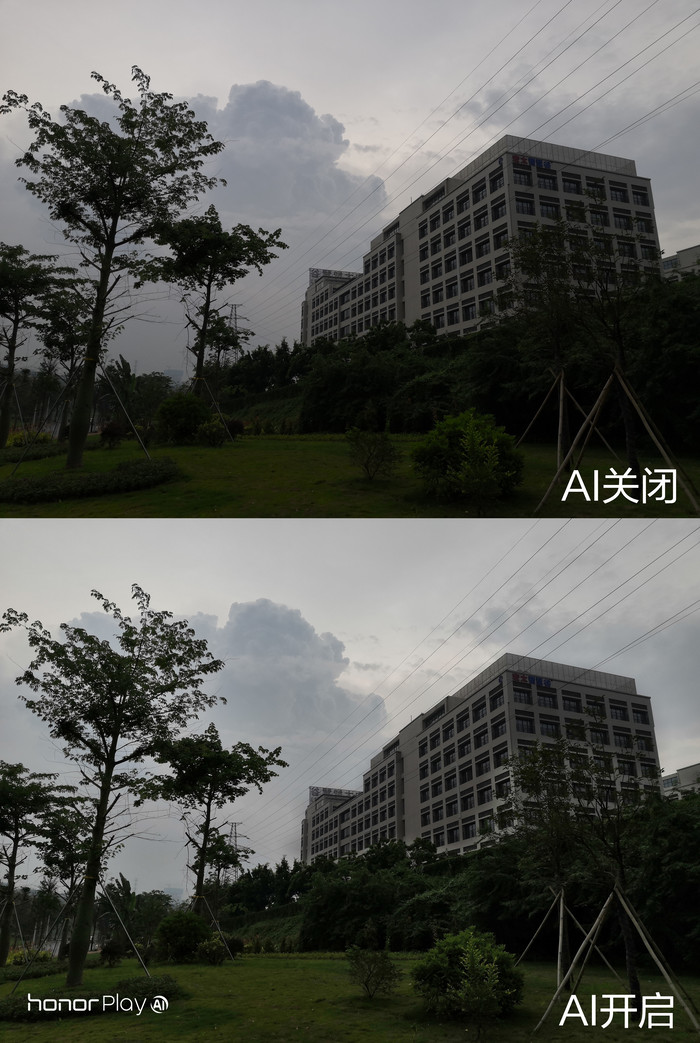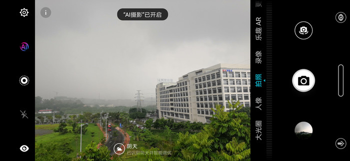通过上方的AI图标,用户手动开启或关闭AI场景识别功能,多达22种类别,500+种场景,AI摄影可以实现实时的识别和优化,实测中,荣耀Play能识别出阴天、夜间等各种场景,并做出专门的优化。
