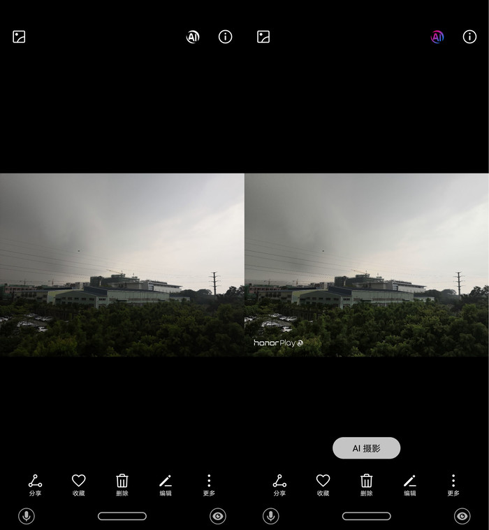 而且和以往的AI优化不同,荣耀Play的AI模式将一次提供两份两张,一份为AI自动后期,一份为原图,给用户提供了更多的选择余地。在相册上方可以选择开启或关闭AI后期,自由度也少有的高。