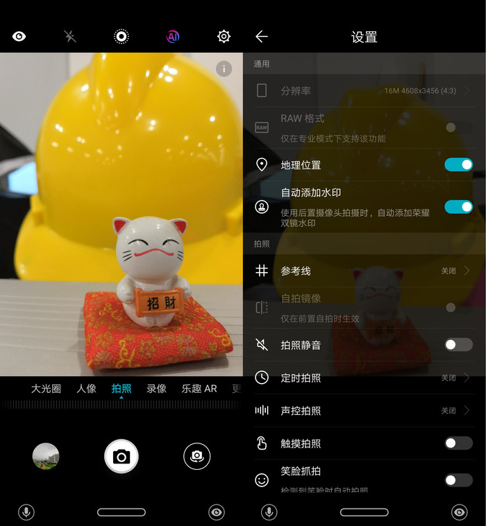 首先看到相机界面,和以往简单直白的风格不同,荣耀Play的相机界面比以往的荣耀机型增添了许多新元素,而整体的UI设计也变得多彩而年轻,符合机型本身定位。不仅有AI拍照的支持,人像光照、大光圈和乐趣AR等模式也没有缺席。
