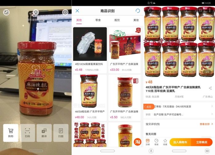 AI功能键比较有趣,点击进去会得到一个类似相机的用户界面,底下有四个选项卡,分别为购物、扫码、翻译和扫题。以购物为例,将镜头对准某一物品后,系统就会对其进行AI识别,并弹出淘宝购物链接——对于热衷于「买买买」的用户而言,该功能还是很方便的。