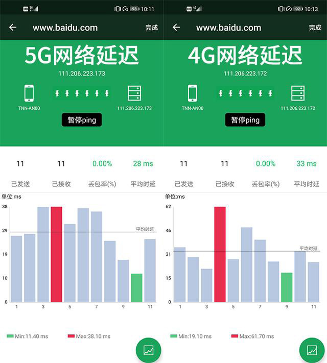 随后,我们打开专业网络测试工具,测试麦芒9在5G网络下访问百度时的延迟。5G网络下,麦芒9最高延迟38.10ms,最低延迟11.40ms,平均延迟28ms;4G网络下,麦芒9最高延迟61.70ms,最低延迟19.10ms,平均延迟33ms。由此可见,麦芒9在5G网络下低延迟优势非常明显。