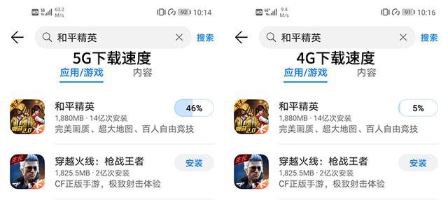 最后,我们使用5G网络在应用商店下载和平精英,打开网速监控,可以看到,5G网络下载的速度约为63.2MB/S,换算成下行速率超过 500Mbps,基本上文的测试结果一致,而使用4G网络时下载速度则降至9.4MB/S。这样看来,麦芒9的5G网络连接能力还是非常出色的。