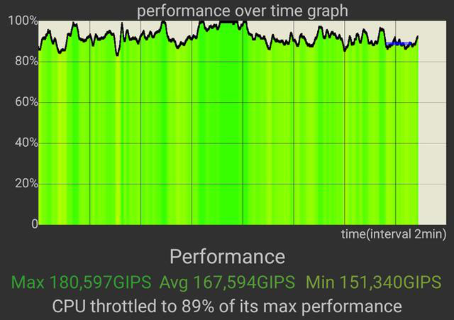 CPU拷机旨在测试手机的性能稳定性表现。我们使用CPU Throttling Test进行了CPU拷机,看一看麦芒9的极限算力表现。在15分钟的测试过程中,麦芒9的CPU可以发挥出至少89%的算力,并冲到了最高的2.00GHz主频,性能输出十分稳定。