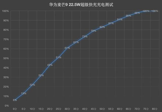 我们从6%开始进行充电测试,30分钟即可充到61%,随后降低充电速率进行三段式涓流补电,最终在第75分钟充满。从测试结果上看,用户可以利用碎片化时间补充近一半的电量,在紧急使用条件下,完全可以满足基本的使用需求。这样看来,麦芒9的性能与续航表现还是非常优秀的,足以支撑其性能的持续稳定输出。