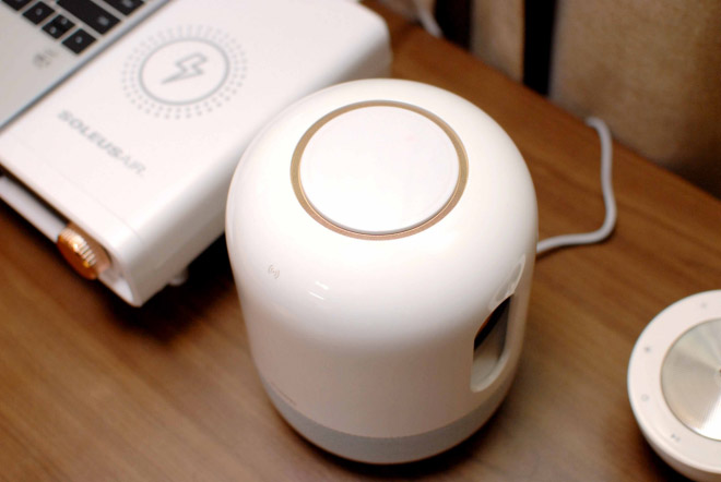 顶部是音箱的触控面板,面板的触控键周边配备了由RGB三色灯组成的光环,专业的导光结构进行混光设计,使得光环的灯效看上去非常的科幻,而且在不同功能和场景下,光环的颜色也会随之变换。
