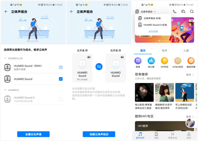 华为Sound智能音箱添加时无需区分左右,但如果用户需要自行调整,我们也可以通过APP切换到合适左右声道,另外,应用会自动分配并确定应答音箱,整个适配的过程可以说相当的快捷,几乎不需要用户过多的干预和操作,这部分体验还是相当不错的。