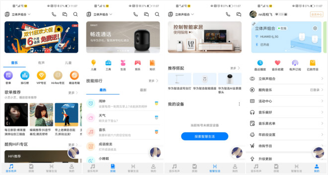 说一下AI音箱的应用界面,一共分有四个版块,分别是音乐有声、技能、智慧生活以及我的,在音乐页面,提供了了上千万的音乐曲库,曲库由华为音乐和酷狗音乐提供,酷狗音乐现隶属腾讯音乐娱乐集团旗下,在音乐版权方面可以说是国内最大的了,所以用华为Sound 智能音箱欣赏音乐你想听的它都有,并且还支持Hi-Res无损音质,基本能够满足更多音乐发烧友对高品质音乐的需求。