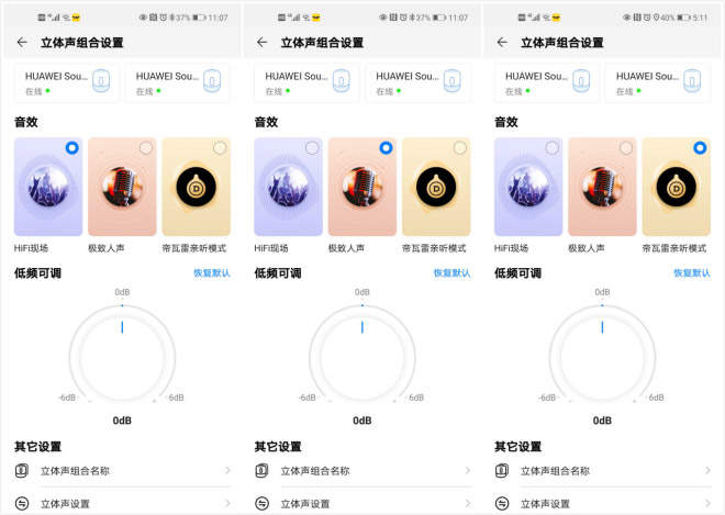 华为Sound 智能音箱的音效提供了三种选择,HIFI现场、极致人声以及帝瓦雷亲听模式,前面两种就不必多说了,现在华为和荣耀手机里都有这些音效提供,但帝瓦雷亲听模式就是华为Sound 智能音箱专属音效了,主要针对于低频的优化处理,说通俗点就是制造下潜力更深的低频,同时又不会出现谐振之类影响听感的音效。当然如果不喜欢官方提供的低频,我们也可以根据需求进行调节,毕竟喜欢华为Sound 智能音箱,除了高清音质之外,我们大多数是冲着震撼的低频来的。