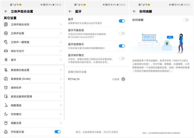应用里有很多对于华为Sound 智能音箱设定的功能,限于篇幅我们选择两个问题和大家说说,一个是蓝牙功能,有些朋友可能说音箱联不到蓝牙,或者蓝牙发现不了音箱,其实是大家没有在APP里开启蓝牙功能,这点和我们常用的蓝牙音箱有点区别,而另一个就是协同唤醒功能,象我这样的花粉家里有多套华为设备时,开启协同唤醒之后,就不是一呼百应,而是实现一呼单响的效果了。