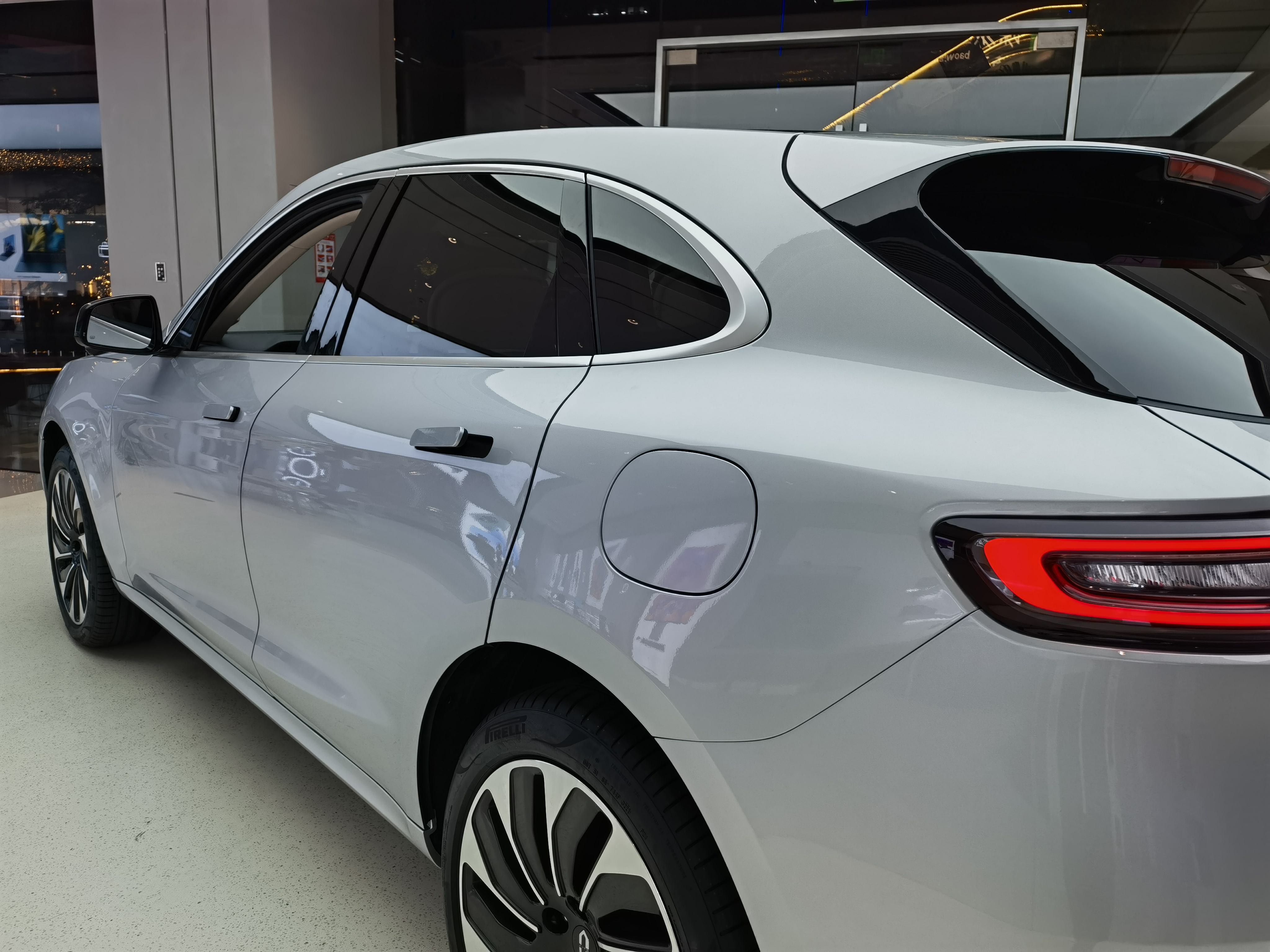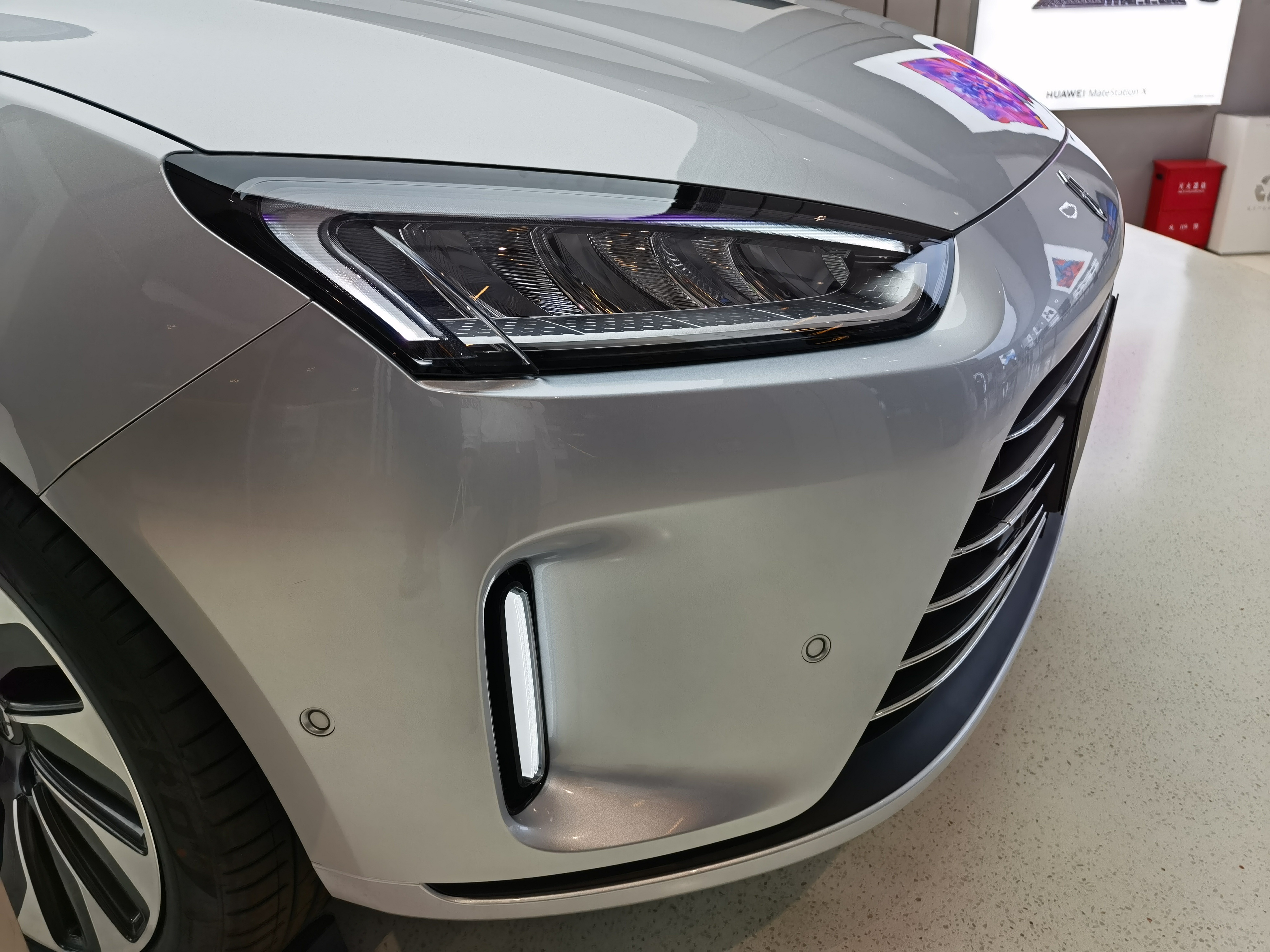 问界M5的前脸采用了中间进气格栅向两侧车灯舒展的设计,一气呵成的弧线顺滑过渡为直线条,峰回路转般衔接流光式鲨鱼鳍内眼角。占比前脸较大的进气格栅区域既最大程度地增加增程器对空气流通交换,又起到装饰车身的作用,看起来科技前卫,运动感十足。