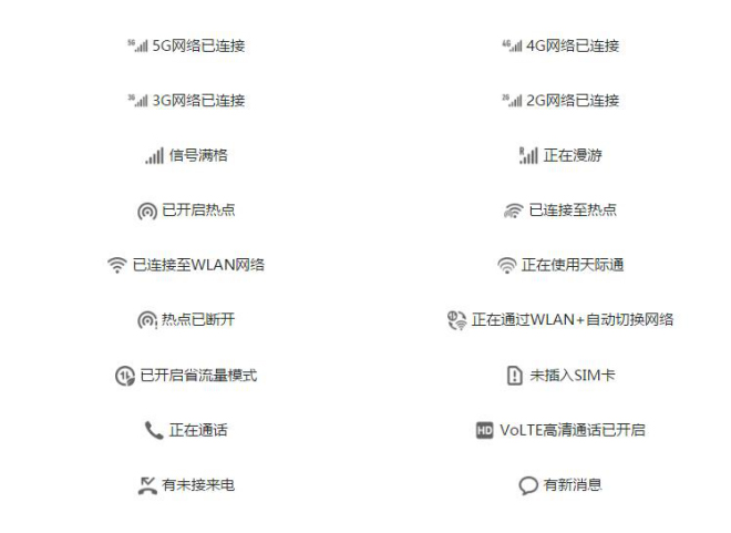 网络状态图标可能因您所在的地区或网络服务提供商不同而存在差异。不同产品支持的功能有差异,以上图标可能不会出现在您的手机上,请以手机实际显示为准。