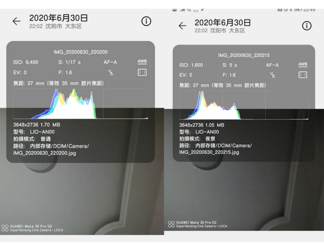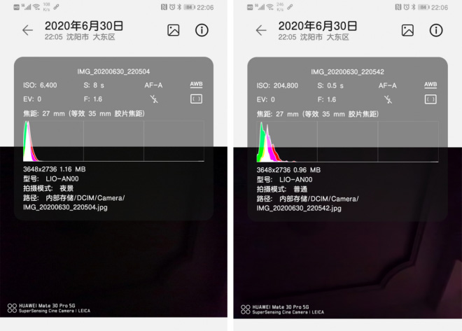 这是由于二者的主要工作原理不同,上图左侧是普通模式,右侧是夜景模式。可以看出明显夜景模式的亮度更暗。因为夜景模式的工作原理是以延长单张照片的曝光时间为主,而普通模式的单拍是AI多帧合成与算法处理,为了看清画面,可以无限制的自动拉高iso,目的只有一个,那就是在AI的引导下将画面尽可能拍清楚。
