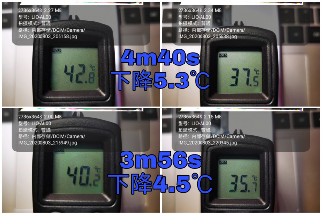 这里也展示了游戏过程中其中两场测试后,荣耀30 Pro+表面最高温度的室温下散热降温情况,分别在游戏后4min40s内下降了5.3℃、3min56s内下降了4.5℃。