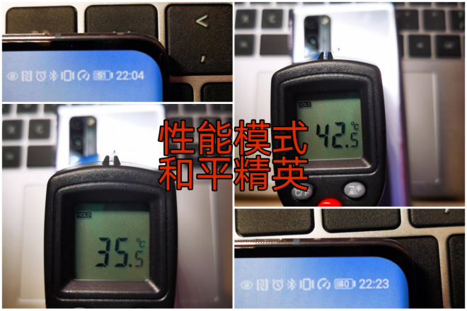 性能模式下,运行和平精英约19分钟,手机表面最高温度从35.5℃升到42.5℃,19分钟耗电11%。与非性能模式比较,游戏测试过程中手机表面出现的最高温度相差不大,仅为0.3℃,19分钟性能模式游戏耗电同20分钟非性能模式都是11%。