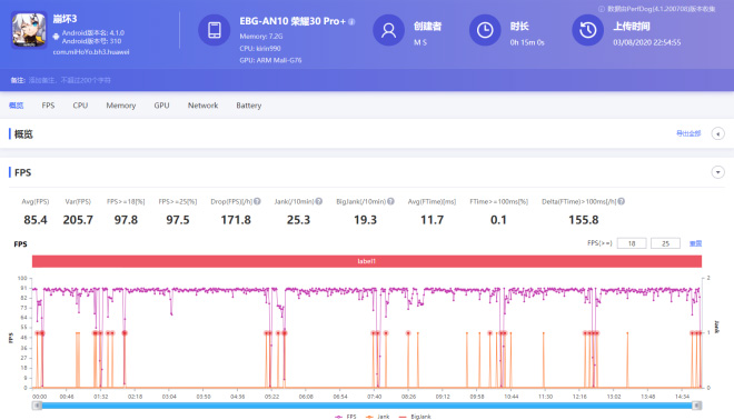 平均游戏帧率为86.2fps,在游戏记录中第14min20s左右开始发生了时长约1min20s的较大帧率波动,实时fps掉到70左右,根据后期针对手机CPU核心温度相关数据记录的核查,考虑是发热导致降帧,但是经过这1min20s左右的时间后,游戏帧率恢复到90fps上下,间接说明荣耀30 Pro+机器内部的散热能力还是不错的。